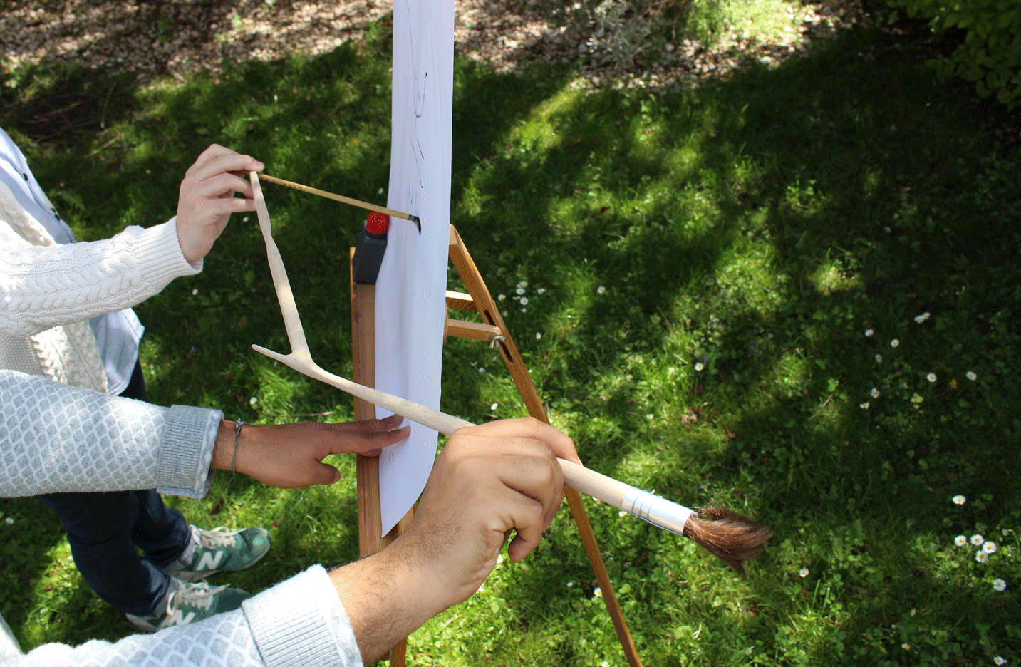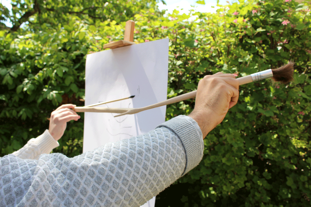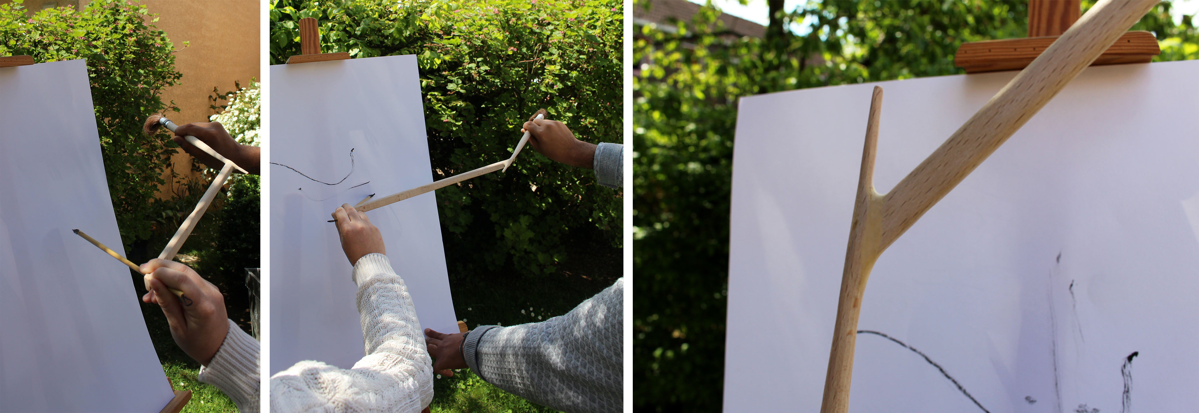 Dans une première expérience, j'ai proposé une métaphore du geste qui s'éduque. Ce pinceau inspiré du pantographe s'utilise à deux, il cristallise la notion de guide, de tandem. Le geste se façonne, s'éprouve au travers de notre expérience individuelle et collective. L'intuition n'est pas innée mais acquise. La lecture intuitive de l'objet peut être faite grâce à des indices formels, esthétiques, culturels qui entrent en résonance avec notre propre expérience.